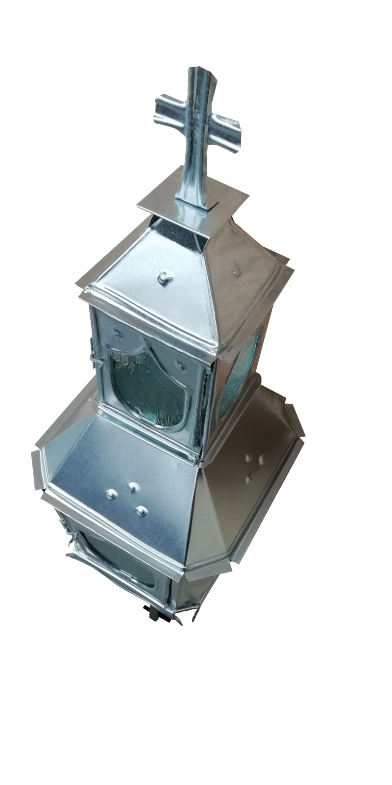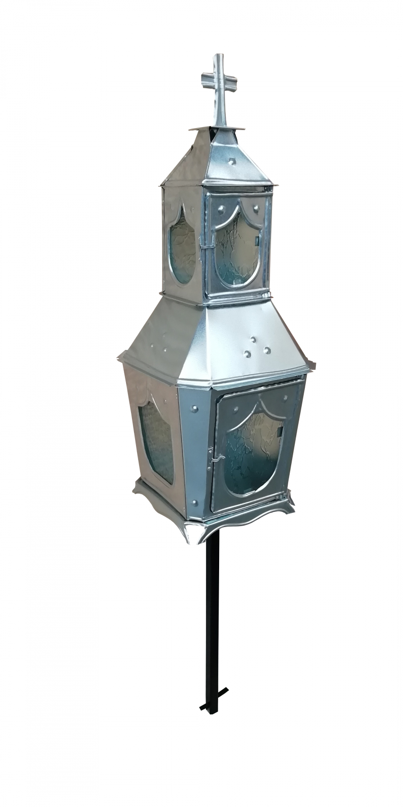 Felinar Funerar etajat cu un design deosebit, confecționat din tabla zincata de 0,4 mm , care este echipat cu 8 geamuri ornamentale și picior din țeavă rectangulara de 30x30 mm negru de 50 cm vopsit in culoare neagra.